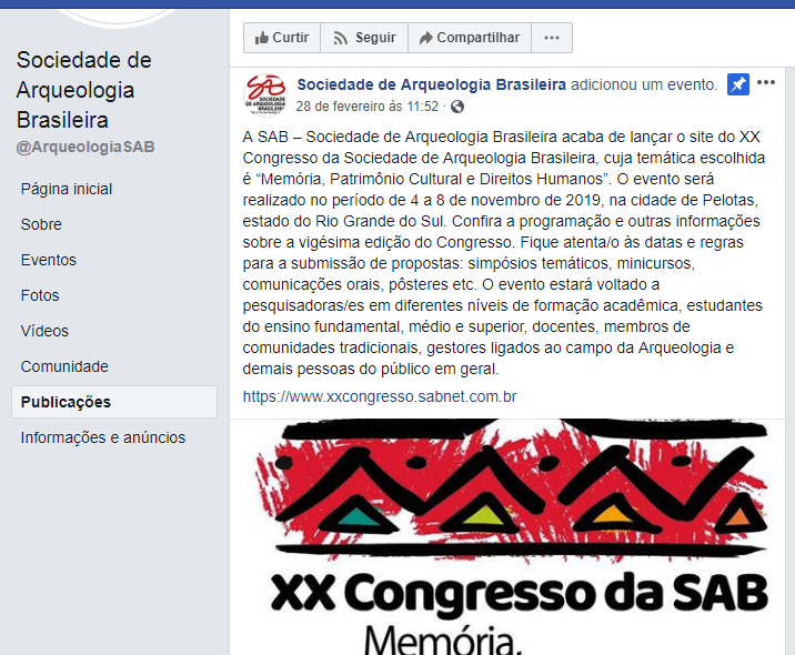 Pelotas – A SAB (Sociedade de Arqueologia Brasileira) usou a sua página no Facebook para divulgar o lançamento do site do XX Congresso da Sociedade de Arqueologia Brasileira, cuja temática escolhida é “Memória, Patrimônio Cultural e Direitos Humanos”.
