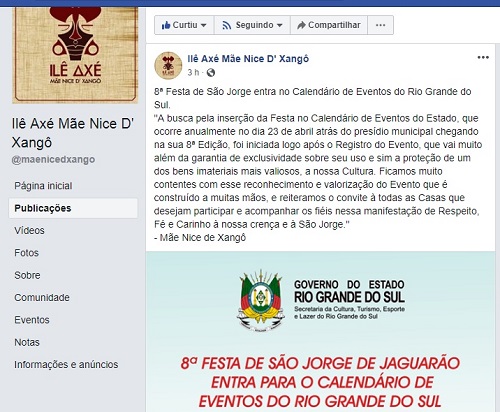 Em nota publicada na página Ilê Axé Mãe Nice D’ Xangô no Facebook, Mãe Nice D’ Xangô celebrou a oficialização do evento realizado em Jaguarão.