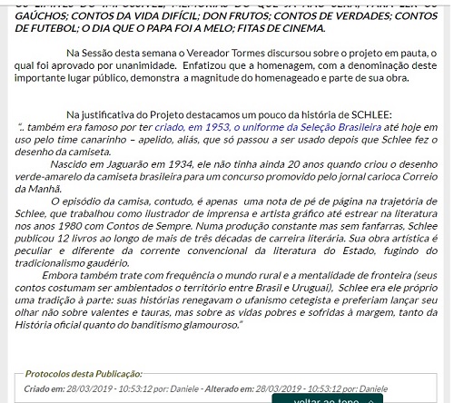 A informação foi publicada no site da Câmara Municipal de Jaguarão, na quinta-feira 28 de março. A autoria do projeto de lei é do vereador Jorge Tormes, do Partido Democrático Trabalhista (PDT). Schlee é reconhecido pela crítica e pelo público como um dos grandes nomes da História da Literatura do Rio Grande do Sul.