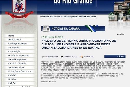 Uma nota publicada no site da Câmara Municipal do Rio Grande informa que os vereadores “aprovaram, nessa quarta-feira [27 de março], Projeto de Lei 57/2019, de autoria do vereador Charles Saraiva”. A proposta determina que as festas alusivas a Iemanjá sejam organizadas pela União Riograndina de Cultos Umbandistas e Afro-brasileiros Mãe Iemanjá, a URUMI.