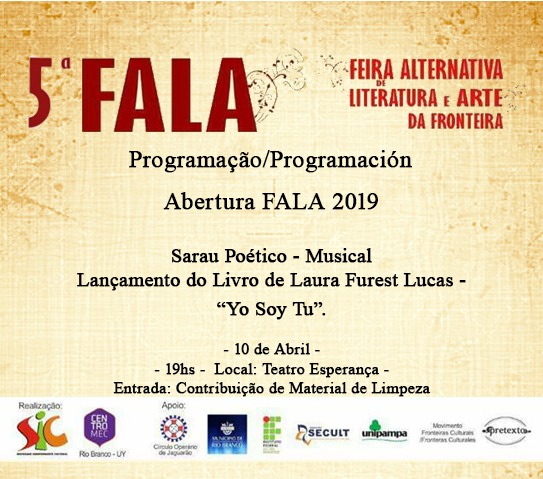 Jaguarão – A abertura da 5ª Feira Alternativa de Literatura e Arte da Fronteira será realizada no Theatro Esperança, às 19 horas da quarta-feira 10 de abril. O evento é promovido pela SIC – Sociedade Independente Cultural, com apoio de demais entidades e poder público local.
