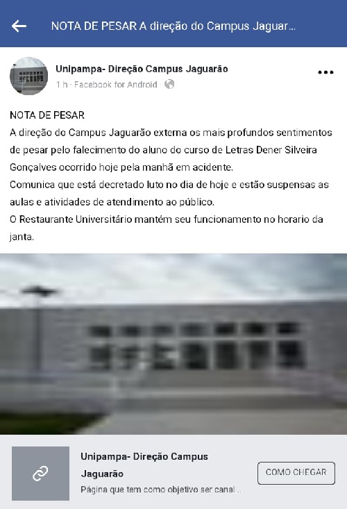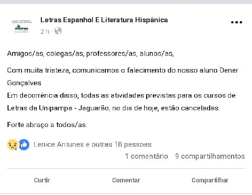 Jaguarão – A direção do campus local da Unipampa (Universidade Federal do Pampa) emitiu, por meio de sua rede social, nota de pesar e determinou a suspensão das aulas na terça-feira 23 de abril após o falecimento do aluno do curso de Letras Dener Silveira Gonçalves.