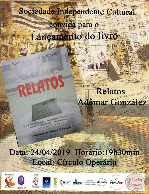 Jaguarão – O livro Relatos, do uruguaio Adémar González, tem lançamento previsto para quarta-feira 24 de abril, às 19 horas, no Círculo Operário, localizado na rua Marechal Deodoro, número 377, centro do município.