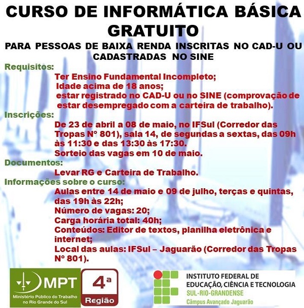 Jaguarão – O Instituto Federal Sul-Rio-Grandense (IFSul) – campus Avançado do município está oferecendo gratuitamente um curso de informática básica. As vagas são limitadas e as inscrições vão até quarta-feira 8 de maio.