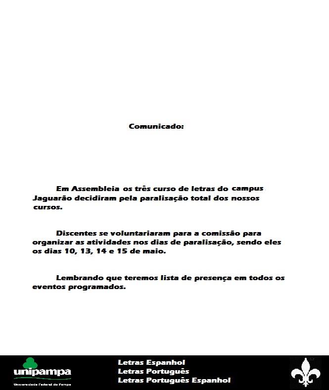 Jaguarão – Estudantes dos cursos de Letras (Português, Espanhol e Português-Espanhol) do campus local da Unipampa (Universidade Federal do Pampa) decidiram, em assembleia realizada na quinta-feira 9 de maio, pela paralisação de suas atividades de sala de aula no período de 10 a 15 de maio.