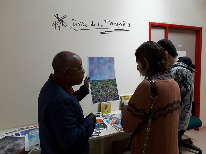 Zé Darci ficará até a quinta-feira 16 de maio apresentando e comercializando produções e reproduções de pinturas, quadros e ilustrações de sua autoria publicadas em obras literárias. É a quinta ou a sexta vez que ele realiza mostra na Unipampa, conforme ele mesmo diz.
