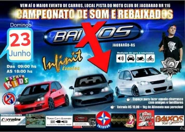 Jaguarão – A pista do Moto Club do município vai receber o Campeonato de Som e Rebaixados. O evento ocorrerá nos domingo 23 de junho, das 9h à 18h. Será cobrada a entrada de R$ 10,00 (dez reais), mais um quilo de alimento não perecível.