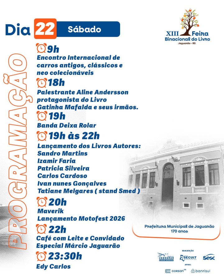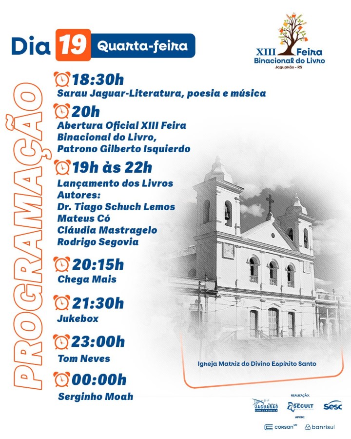 Jaguarão – A programação da Feira Binacional do Livro de Jaguarão 2025 foi oficialmente anunciada. De 19 a 23 de novembro, a conhecida Cidade Heroica vai se transformar em um grande ponto de encontro entre literatura, música, arte e identidade pampeana.