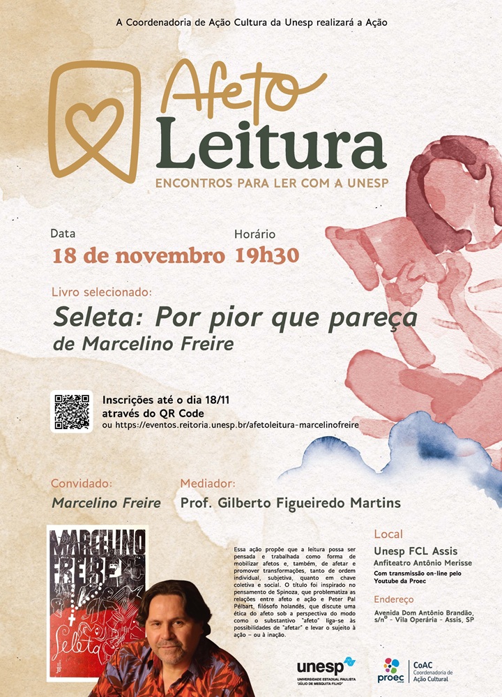 A visita de Marcelino Freire integra a segunda edição do projeto “Afeto Leitura – Encontros para Ler com a Unesp”, realizado pela Coordenadoria de Ação Cultural (CoAC). O evento será no Anfiteatro Antônio Merisse, na Faculdade de Ciências e Letras.